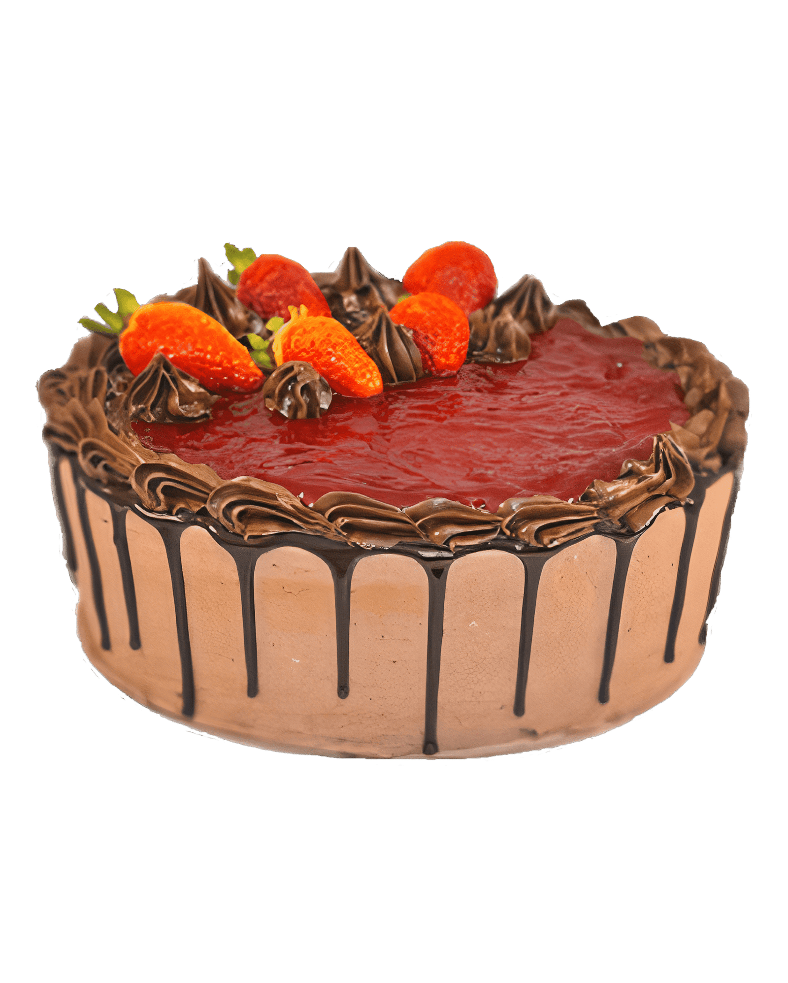 Three layers of chocolate sponge are filled with chocolate cream, a strawberry filling, and adorned with chocolate curls and fresh strawberries for a delightful treat, promising a symphony of flavors and textures.