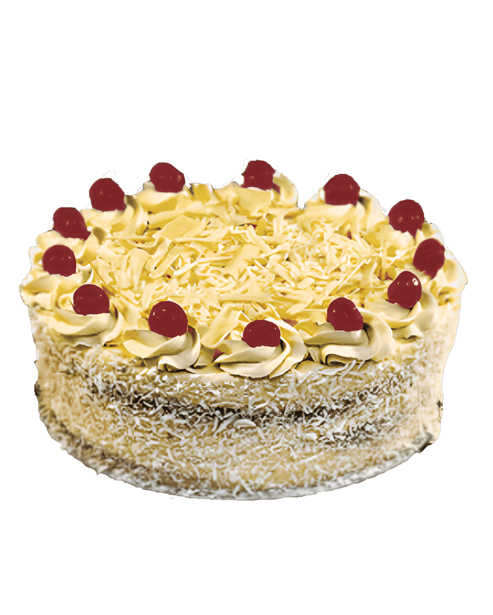 Three layers of vanilla sponge, filled with fresh cream, cherries, and topped with white chocolate and shredded coconut, promise a delightful blend of flavors and textures. Each bite offers a burst of tartness, sweetness, and creaminess for a truly delightful experience. Perfect for a moment of sweet bliss.